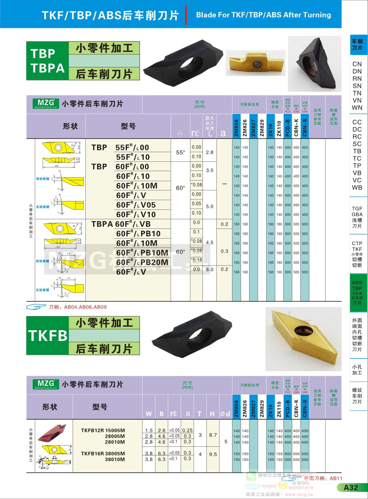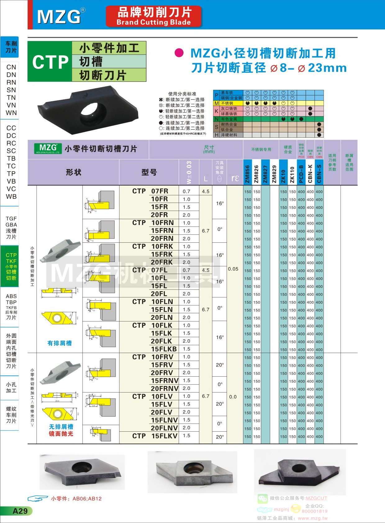 MZG數(shù)控刀具CTP切斷/TTP螺紋/TBP后車削小零件加工刀具刀片產(chǎn)品技術(shù)參數(shù)配件組成信息